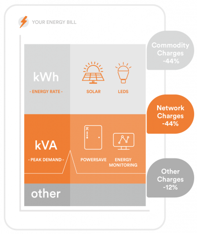 In addition to your standard energy charges (e.g. $/kWh), many businesses are also hit with an expensive network demand charge ($/kVA). This means you are billed for the power supplied in kilovolt ampere (kVA), as well as your energy used in kilowatt hours (kWh).